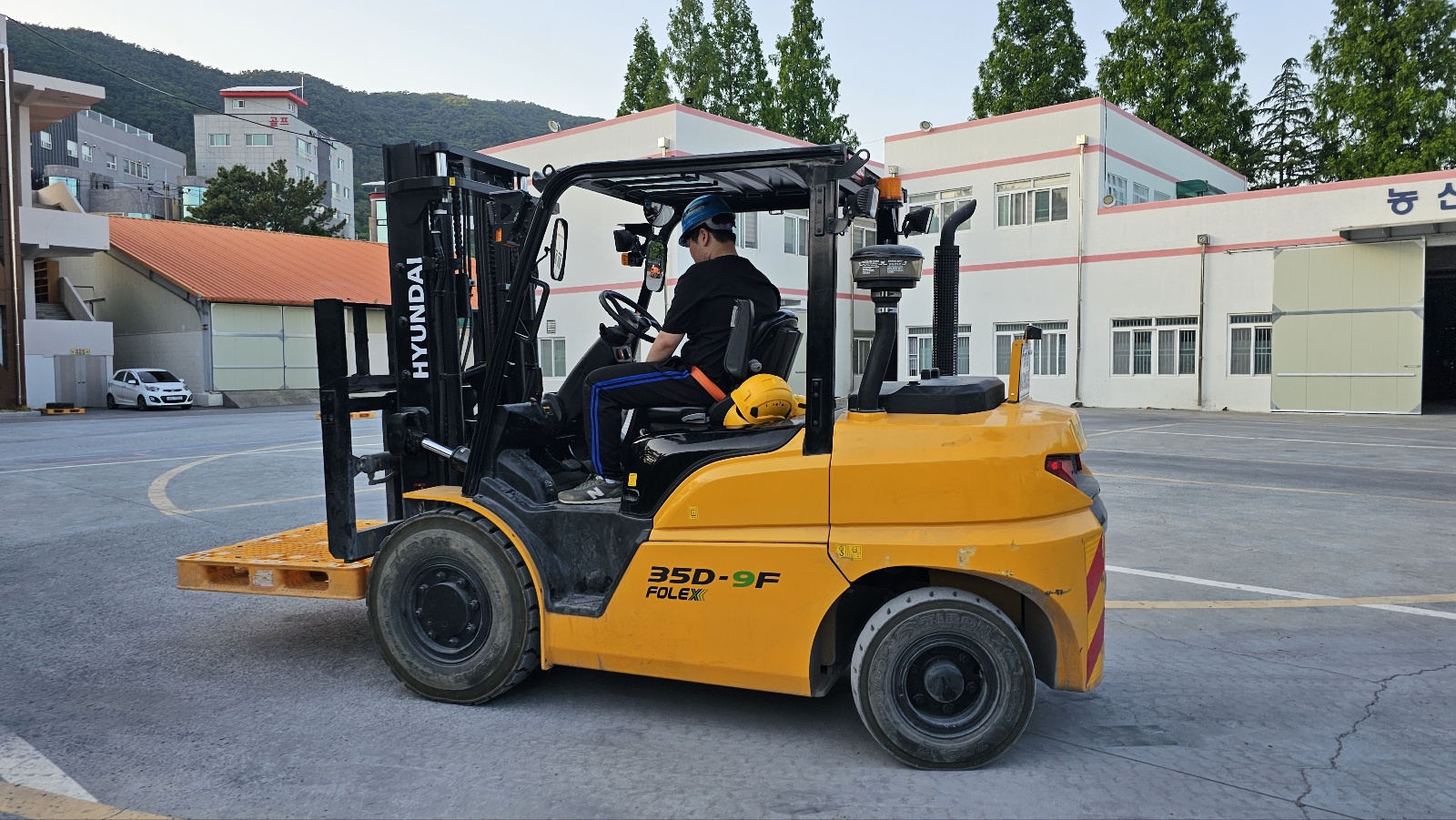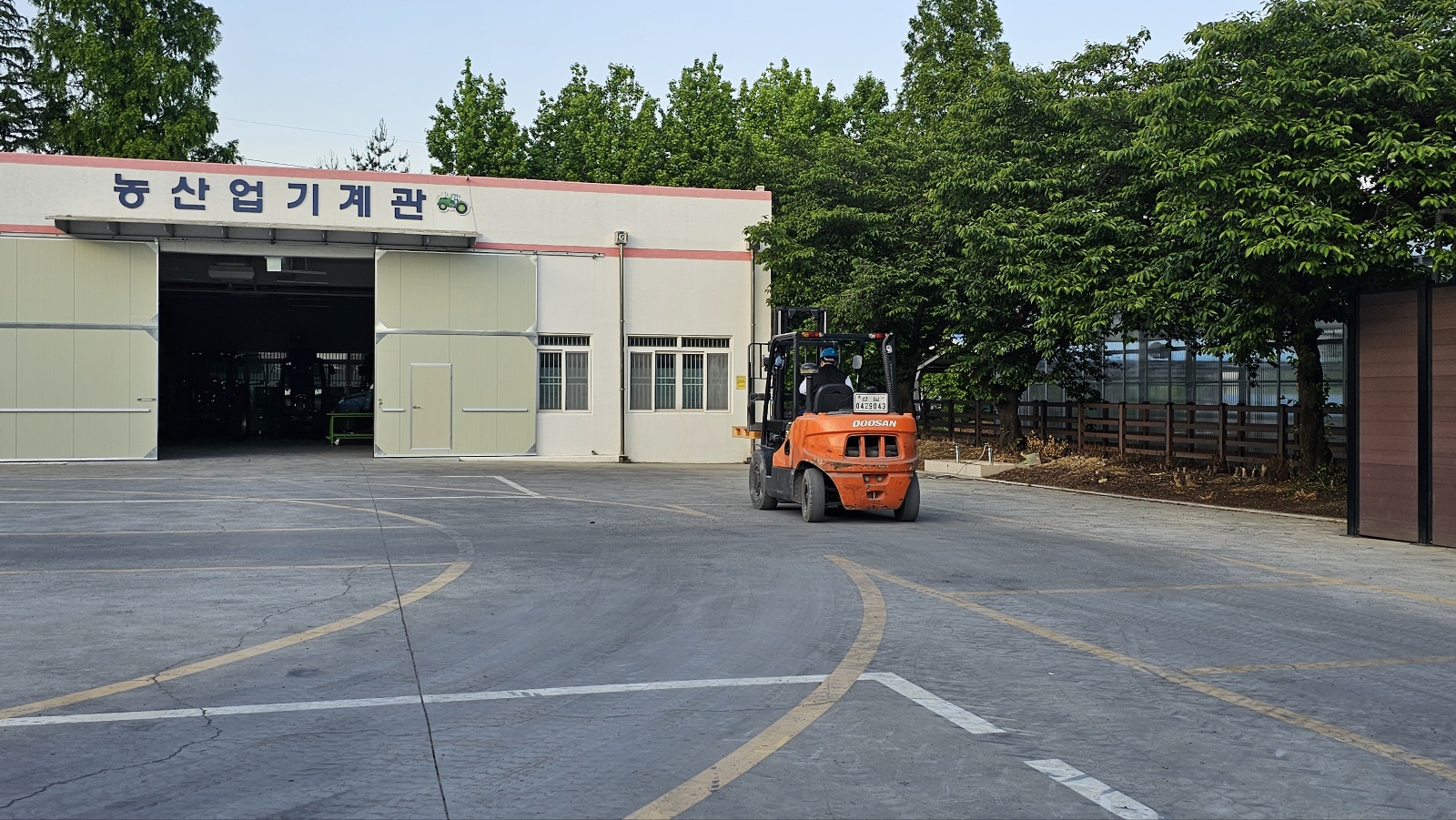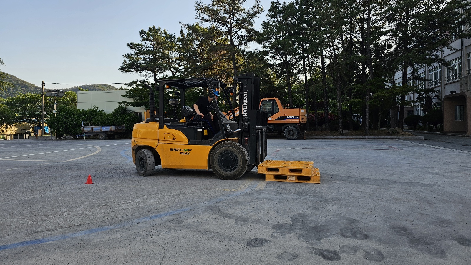 지게차 운전 기능사를 대비해서 실기 코스 연습을 하고 있는 모습입니다.