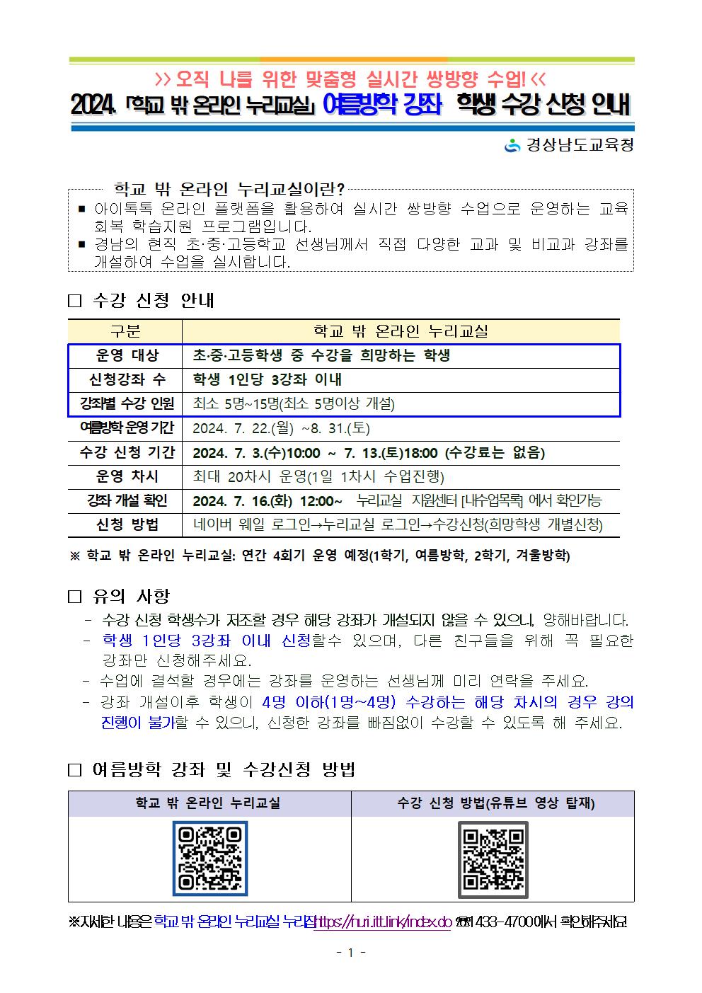 2024. 학교 밖 온라인 누리교실 여름방학 강좌 수강생 모집 안내
