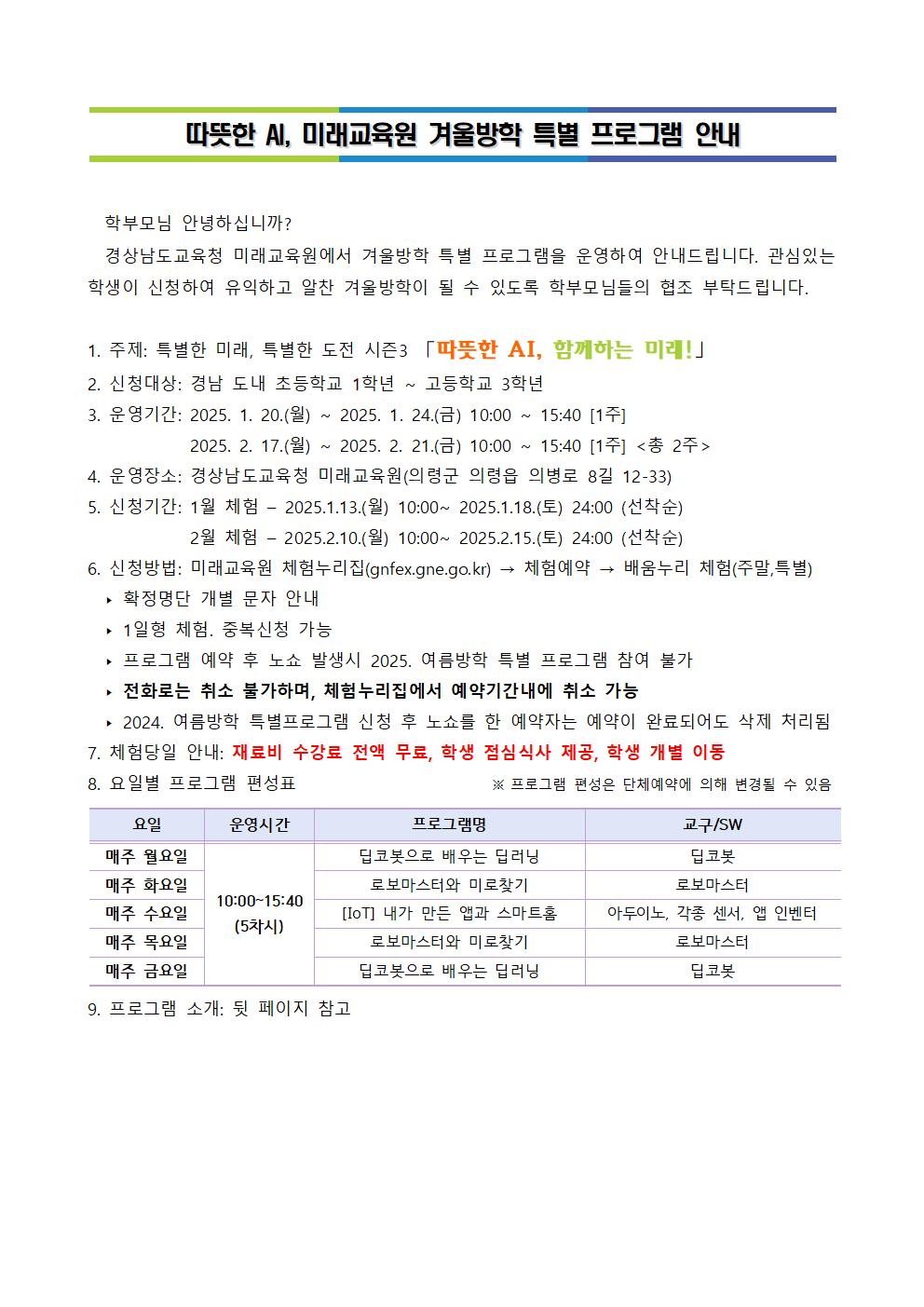 2024. 경남교육청 미래교육원 겨울방학 프로그램 안내